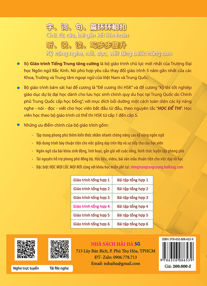 Bộ giáo trình này bao gồm 6 quyển Sách Bài học tổng hợp, 6 quyển Sách Bài tập tổng hợp1, 4 quyển Sách giáo trình Nghe. Bài học và Bài tập phối hợp với nhau, mỗi quyển 16 bài. Giáo trình tuân thủ nghiêm ngặt yêu cầu của “Đề cương thi HSK” và đề cương “Kỳ thi tốt nghiệp giáo dục dự bị đại học dành cho lưu học sinh chính quy du học tại Trung Quốc do chính phủ Trung Quốc cấp học bổng”, sắp xếp cụ thể như sau: